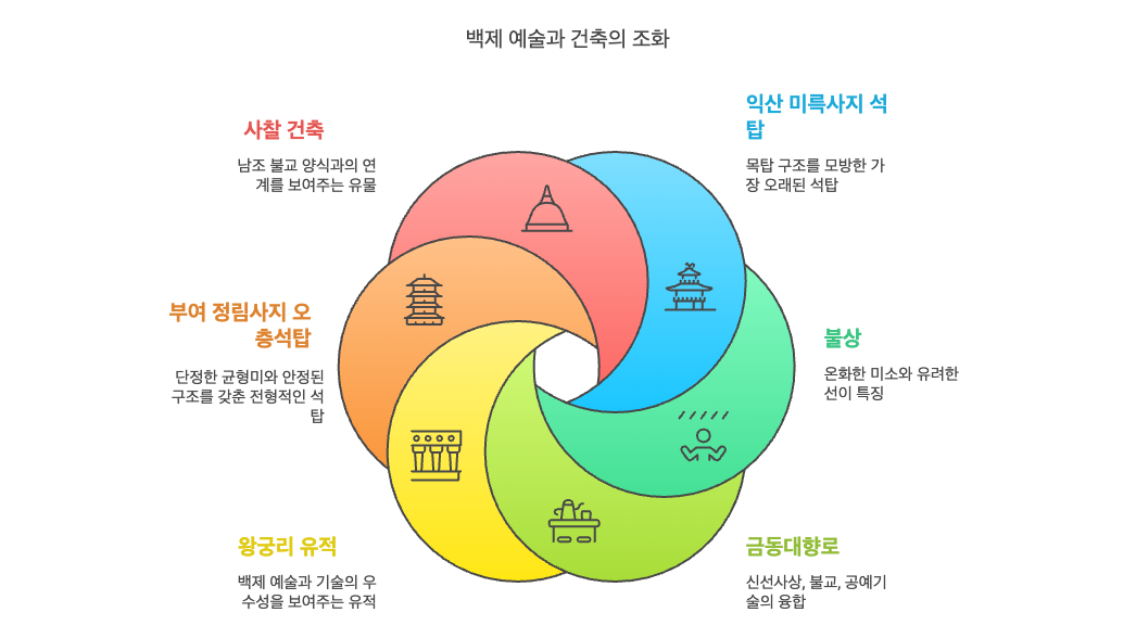 백제는 온화한 자연과 조화를 이룬 건축과 예술로 평가받습니다. 익산 미륵사지 석탑은 현존하는 가장 오래된 석탑으로, 목탑 구조를 모방한 세련된 비례미를 갖추고 있습니다. 불상은 온화한 미소와 유려한 선이 특징이며, 금동대향로는 백제 예술의 절정으로 신선사상과 불교, 공예기술이 융합된 걸작입니다. 왕궁리 유적과 사찰, 공방 유적 등은 백제 예술과 기술의 우수성을 보여줍니다. 부여 정림사지 오층석탑은 단정한 균형미와 안정된 구조로 백제 석탑 양식의 전형을 이루며, 사찰 건축 또한 남조 불교 양식과의 연계를 보여주는 유물입니다. 백제의 조형미는 유려함과 실용성이 함께 조화된 것으로, 일본 아스카 문화에도 깊은 영향을 미쳤습니다.