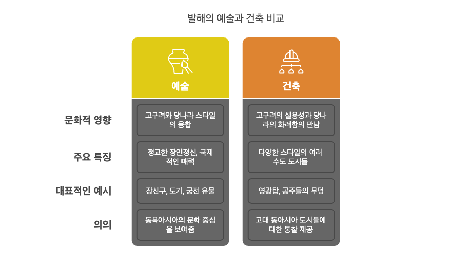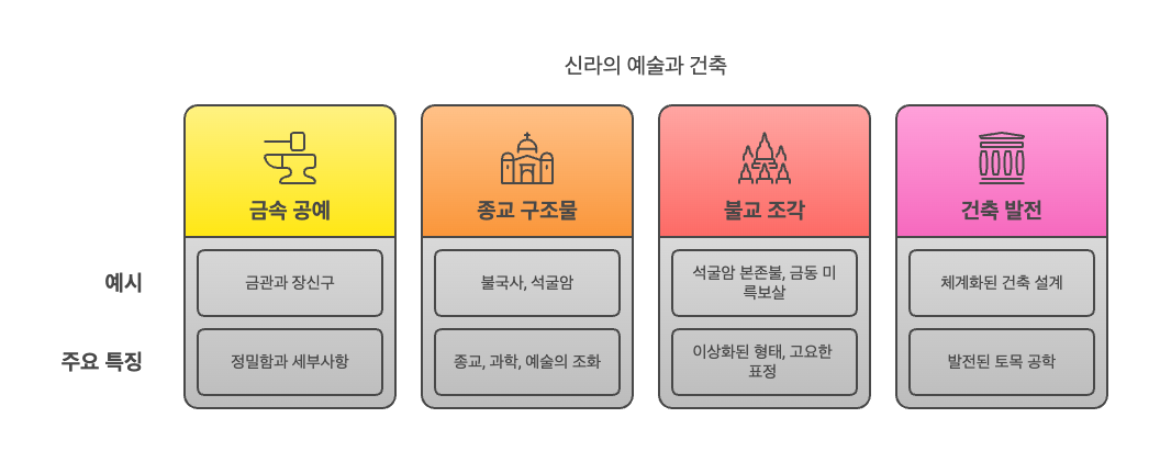 - 통일신라는 불국사·석굴암 등으로 조형 예술이 절정에 달하였고, 발해는 고구려의 전통과 당나라 문화의 융합을 통해 독자적 양식을 형성했습니다.