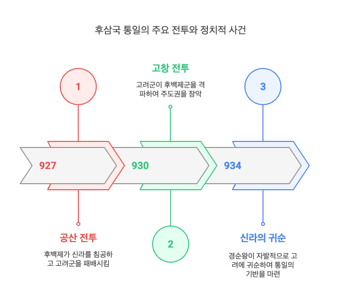 927년, 후백제는 신라를 침공하여 경애왕을 시해하고 대구 공산에서 고려군을 공격하였습니다. 이 전투에서 고려는 김락이 전사하는 등 패배를 경험하였지만, 왕건은 전열을 재정비하고 지방 호족과 협력하여 전력을 강화합니다. 930년 고창(안동) 전투에서 고려군은 후백제군에 승리하며 주도권을 장악하고, 934년 신라의 마지막 왕 경순왕이 자발적으로 고려에 귀순하면서 통일의 기반이 확립됩니다.