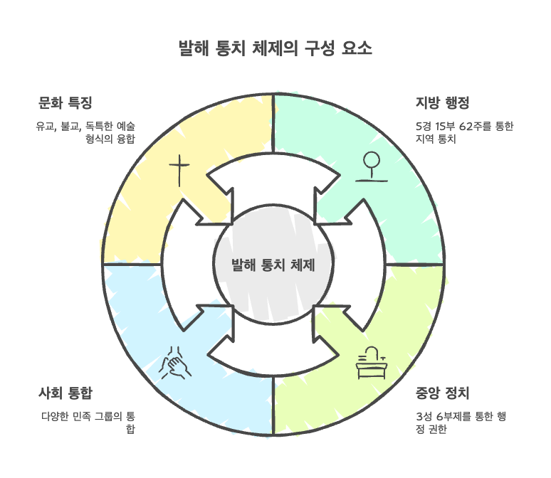 - 지방 통치 체계 - 5경 15부 62주: 중앙의 수도를 포함한 5경 체제를 통해 전국 주요 지역을 연결하고, 15부 62주의 지방 행정 구역을 통해 광대한 영역을 효율적으로 통치했습니다.