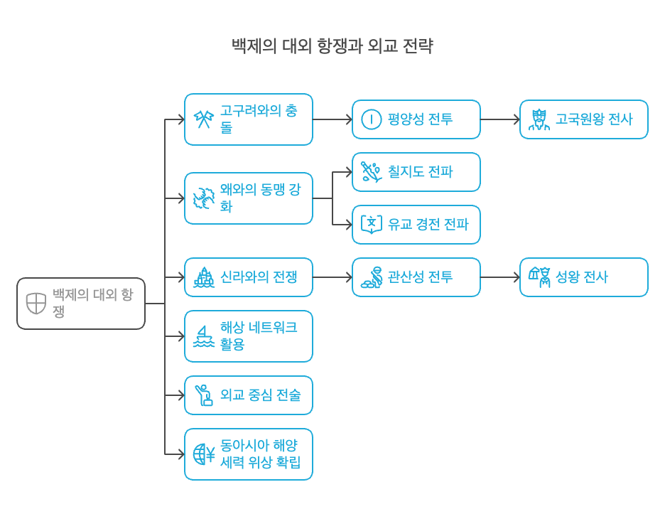 - 고구려와의 충돌: 근초고왕 때 평양성을 공격해 고국원왕을 전사시킴. 북진정책의 정점이었습니다.