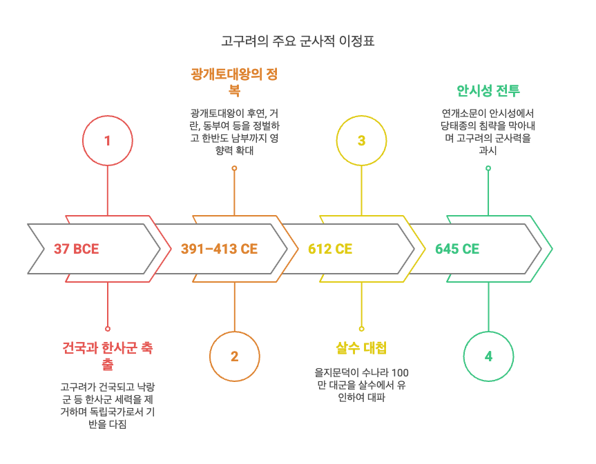 - 수나라 침공 격퇴(612): 을지문덕이 이끈 살수 대첩에서 수나라 100만 대군을 유인하여 대파. 이는 동아시아 전쟁사에서 손꼽히는 전술적 승리였습니다.