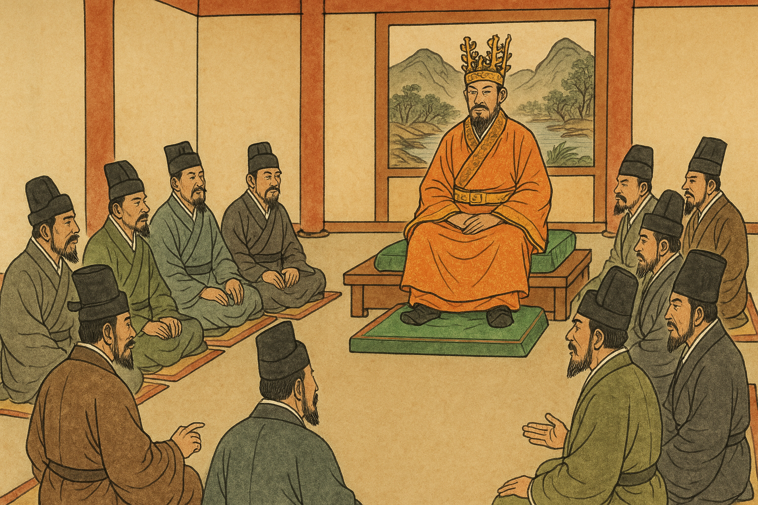 삼국 시대 왕과 귀족들이 정치 회의를 진행하는 모습입니다. 왕이 중심에 앉아 회의를 주재하고, 귀족들이 양옆에 배석해 논의하는 장면을 통해 각 왕국의 회의 문화와 권력 구조를 상상해볼 수 있습니다.
