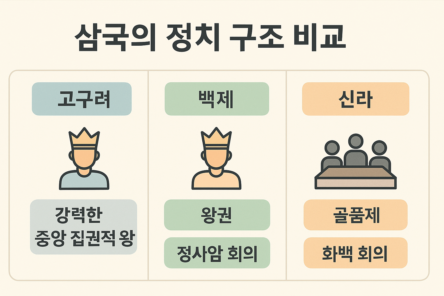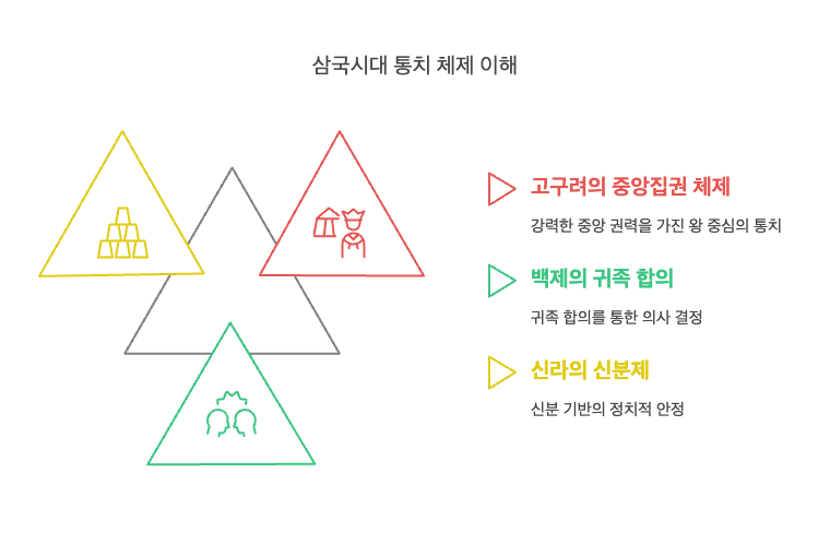 삼국의 통치 체제는 단순한 권력 구조를 넘어서, 각 사회의 철학과 가치관, 정치적 긴장 관계를 반영하는 중요한 틀이었습니다. 오늘날 우리는 이 구조를 통해