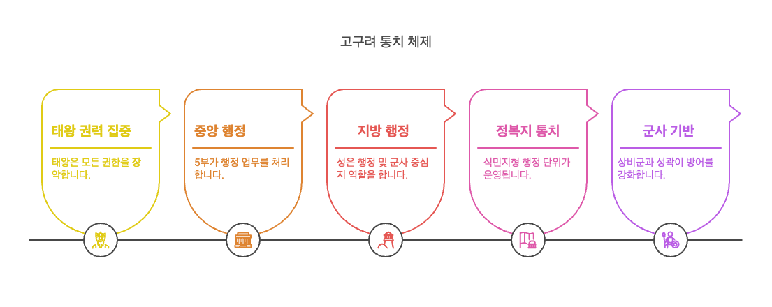 고구려는 태왕을 중심으로 한 강력한 중앙집권 체제를 갖추었습니다. 태왕은 군사, 정치, 종교 권한을 모두 장악하며 국정 운영의 중심에 섰습니다. 수도인 국내성에는 중앙 행정을 담당하는 5부가 설치되어 행정, 군사, 재정 등의 업무를 기능적으로 분담했습니다.