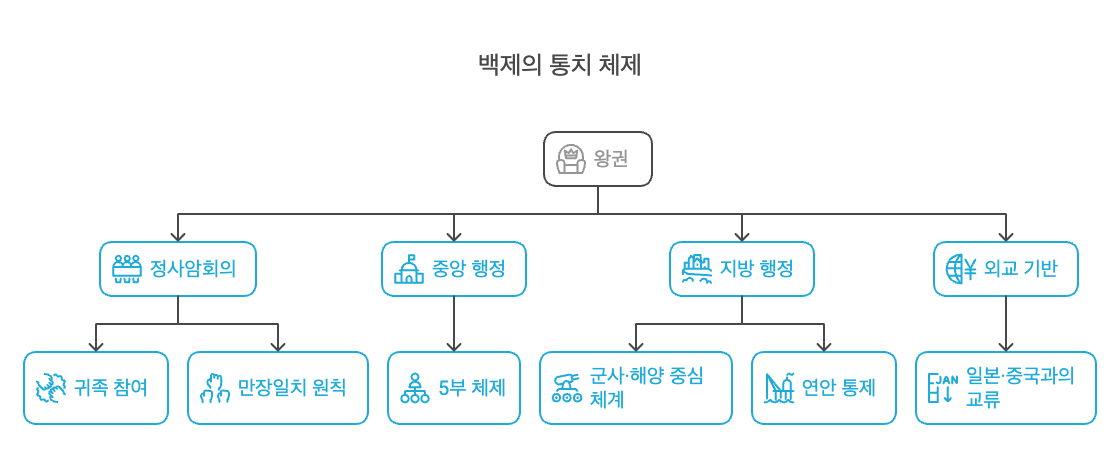 백제는 왕권과 귀족 세력이 균형을 이루는 정치 체제를 운영했습니다. 왕은 국정을 총괄했지만, 중요한 정책 결정은 귀족 회의인 정사암회의를 통해 이루어졌습니다. 이 회의는 초기 귀족 세력의 정치 참여를 반영한 합의 기구로, 왕위 계승이나 외교 정책 등 중대한 사안을 논의한 사례가 있습니다. 고위 귀족들이 참여해 만장일치로 결정을 내리는 방식은 왕권의 독주를 견제하고 귀족 간 이해관계를 조율하는 데 중요한 역할을 했습니다.