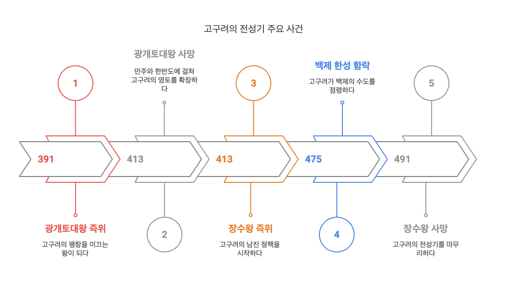 - 대표 왕: 광개토대왕(재위 391~413), 장수왕(재위 413~491)