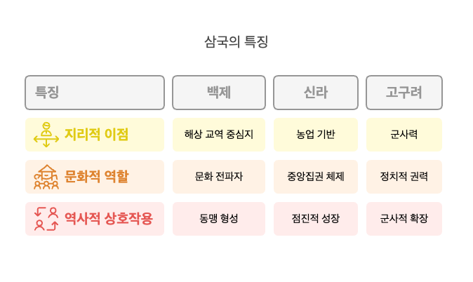 삼국은 각기 다른 지역적 환경과 역사적 배경 속에서 독자적인 정치 체계와 문화를 발전시켰습니다. 예를 들어, 백제는 한강 유역이라는 교통 요충지를 기반으로 해상 교역과 외교를 활발히 전개하였고, 신라는 경주 분지를 중심으로 한 농업 생산 기반 위에 안정적인 내부 성장을 이루었으며, 고구려는 산악 지형과 만주의 넓은 평야를 활용하여 군사력을 강화하고 영토를 확장해 나갔습니다. 백제는 해상 교역과 예술 문화를 바탕으로 동아시아 문화 전파의 중심이 되었고, 일본에 불교와 한자, 건축 양식 등을 전파하여 아스카 문화의 기초를 형성하는 데 중요한 역할을 하였습니다. 신라는 점진적인 성장과 내부 통합을 통해 안정된 중앙 집권 체제를 구축하였으며, 고구려는 강력한 정복과 군사력으로 동북아시아의 패권을 장악하며 정치ㆍ문화적 역량을 발휘하였습니다.
