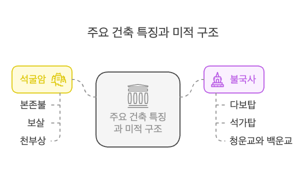 불국사의 다보탑과 석가탑은 서로 대조적인 아름다움을 지닌 쌍탑입니다. 다보탑은 입체적이고 화려한 형태이며, 석가탑은 간결하고 정제된 구조로 균형을 이룹니다. 청운교와 백운교는 우아한 곡선미를 지닌 계단식 교량으로 국보로 지정되어 있으며, 목조 전각들은 석단 위에 조화롭게 세워져 전체 구조의 아름다움을 더합니다.