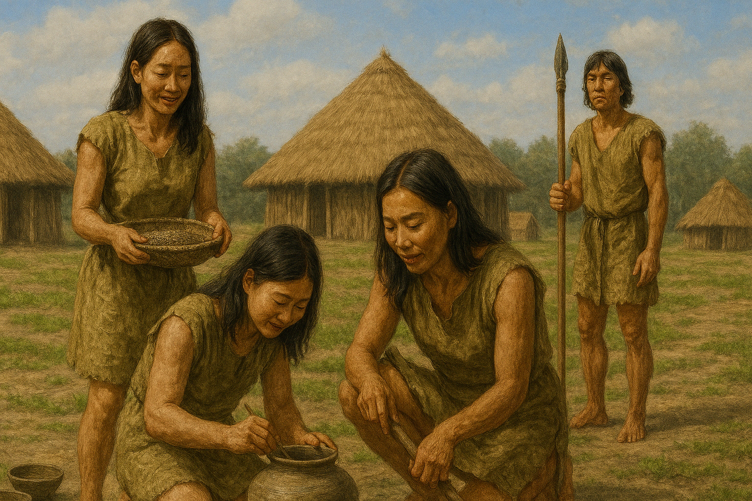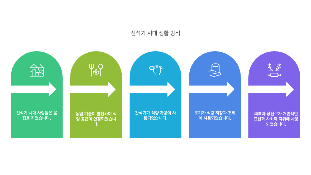 신석기 시대 사람들은 강가나 바닷가 근처에 모여 살며 농사를 짓고 가축을 키우기 시작했습니다. 이러한 변화는 인류가 자연에 의존하던 수렵과 채집 생활에서 벗어나 스스로 식량을 생산하는 새로운 삶의 방식으로 나아가게 만든 중요한 발전이었습니다.