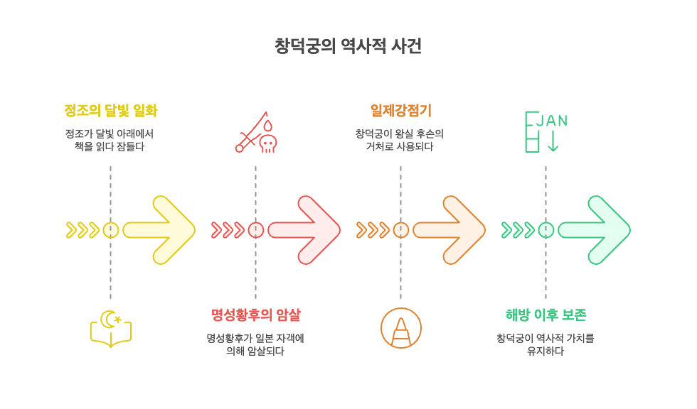 또한 명성황후가 일본 자객에 의해 시해된 건청궁은 창덕궁 후원 깊숙한 곳에 위치했던 별궁으로, 현재는 터만 남아 있습니다. 이처럼 창덕궁은 단순히 아름다운 경관만이 아닌, 조선의 마지막 왕과 황후가 역사의 무게를 마주한 공간이기도 합니다.
