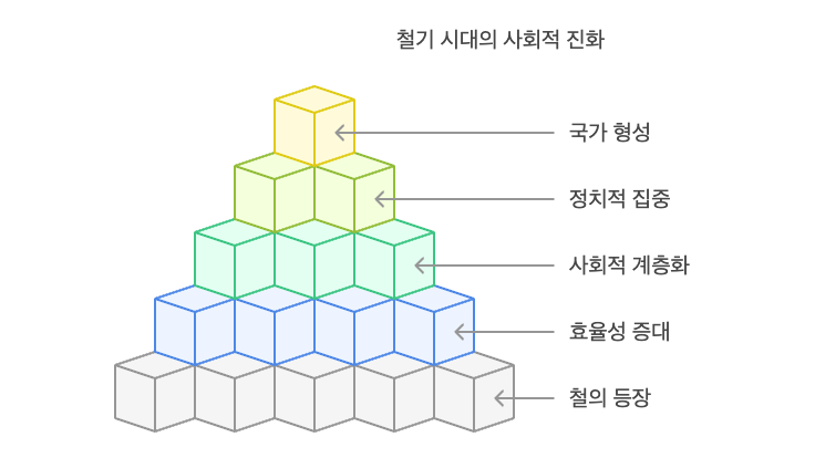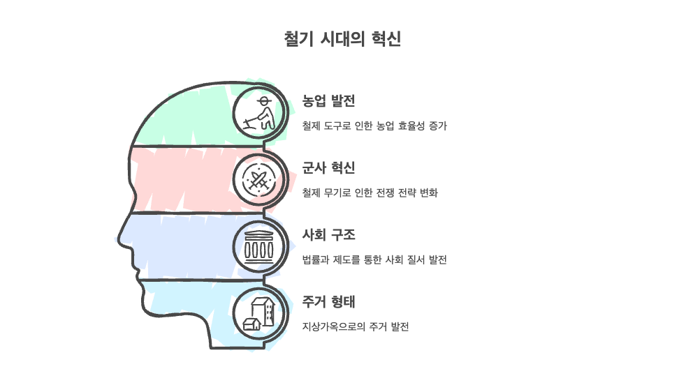 철기 시대는 철이라는 강력한 자원의 등장을 통해 인류 문명의 질적 도약을 이룬 시기입니다. 농업과 전쟁에서의 효율성 증대는 곧 계층화, 제도화, 정치적 집중으로 이어졌으며, 한반도 고대 국가 형성의 토대를 마련했습니다.
