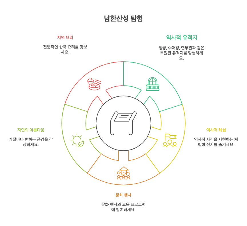 특히 남문 근처에는 당시 상황을 재현한 작은 역사체험관이 있어 아이들과 함께 둘러보기에 좋으며, 산성 곳곳에는 전통 순두부와 백숙 등을 파는 맛집들이 자리하고 있어 몸과 마음의 여유를 선사합니다. 성곽을 완주하는 데는 약 3~4시간이 소요되며, 그 과정 자체가 조선시대를 체험하는 하나의 여정이 됩니다.