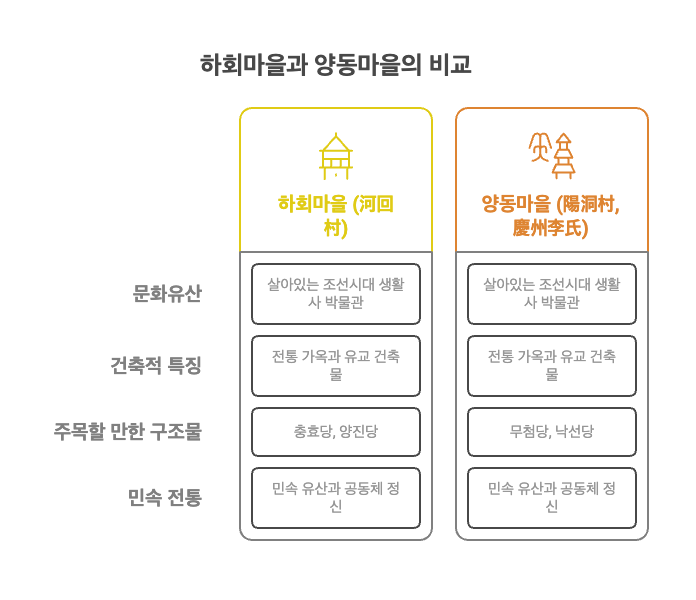 두 마을은 각기 다른 지역에 위치하고 있지만, 공통적으로 씨족 중심의 유교 공동체 문화를 기반으로 형성되었습니다. 하회는 낙동강이 유유히 흐르는 평지에 자리하고 있고, 양동은 산세 깊은 계곡에 집들이 흩어져 있어 지형적 다양성 속의 공통된 전통을 보여줍니다. 하회는 유려한 물길이 마을을 휘돌며 느린 시간을 선사하고, 양동은 산등성이를 따라 가옥이 층을 이루어 조선시대의 자연 속 정주방식을 생생히 증명합니다.