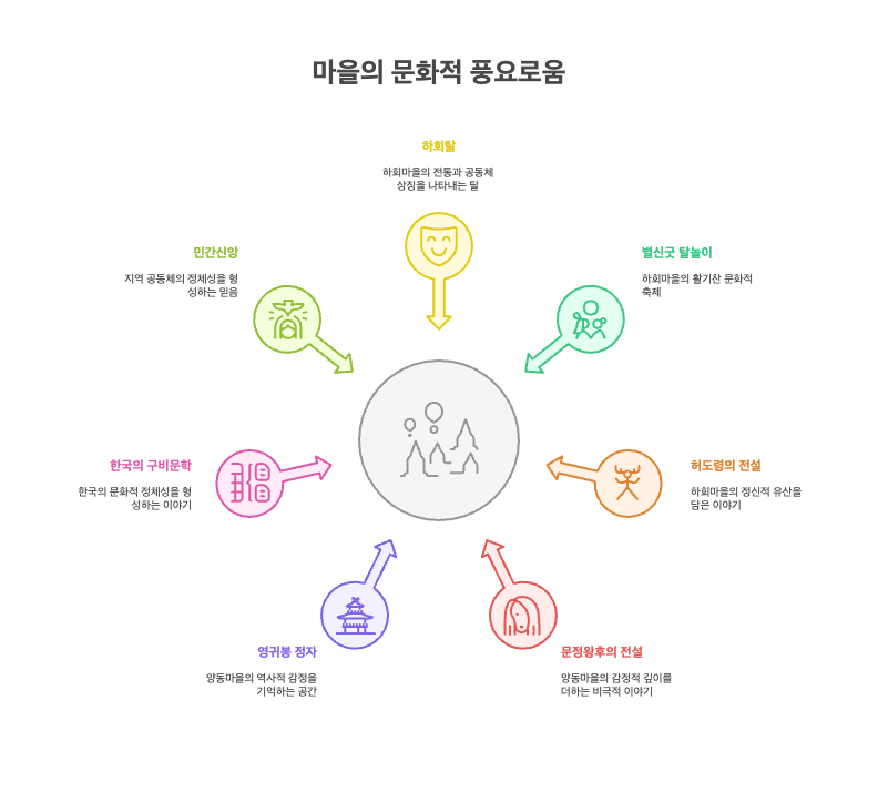 • 하회마을에는 하회탈별신굿 탈놀이 전통이 지금도 살아있습니다. 전설 속 허도령의 이야기는 단지 설화가 아니라, 이 마을에서 살아온 사람들의 정신적 유산과 공동체의 상징성을 담고 있습니다. 해마다 열리는 탈춤축제는 전통과 현대가 어우러진 문화의 장으로, 국내외 관람객들의 큰 호응을 얻고 있습니다.